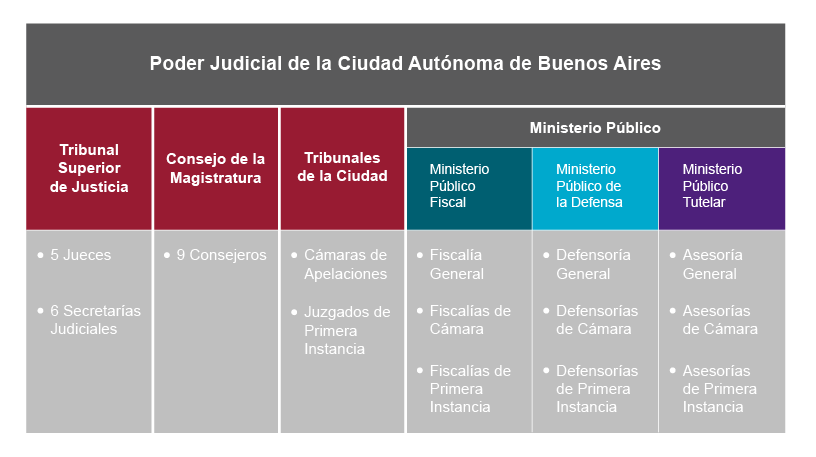 El Poder Judicial de la Ciudad Autónoma de Buenos Aires está integrado por el Tribunal Superior de Justicia, el Consejo de la Magistratura, los demás tribunales que la ley establezca y el Ministerio Público.
